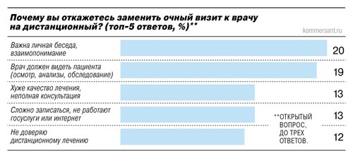 Рост интереса к телемедицинским консультациям у россиян наблюдается с 2019 года, сообщали ранее “Ъ” в Минздраве. Самыми востребованными специалистами при проведении онлайн-приемов, по данным министерства, являются онкологи, педиатры, кардиологи и гинекологи. До последнего времени телемедицина в госсекторе развивалась в основном в формате «врач—врач», а прямые консультации для пациентов активнее тестировались больше в частной практике, пояснил “Ъ” сопредседатель Всероссийского союза пациентов (ВСП) Юрий Жулёв. Теперь же в программе госгарантий появилась возможность телемедицинских консультаций «врач—пациент»: в ВСП надеются на их масштабное применение в системе поликлиник. При этом, отмечает господин Жулёв, важно обсуждать механизмы, как именно проводить телемедицинскую консультацию — «с четким пониманием этапов оказания помощи, требований к идентификации пациента и медицинской ответственности». Эксперт также подчеркивает, что телемедицина не должна подменять очный прием там, где необходимы осмотр и постановка диагноза.