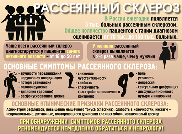 Рассеянный склероз — это заболевание, обусловленное повреждением и рубцеванием оболочек нервных волокон. Развивается в головном и спинном мозге. Наследственной эту болезнь не считают, но если у человека есть родственники, страдающие этим недугом, риск заболеть несколько выше. В основном им болеют молодые люди, даже дети. Что примечательно, у женщин рассеянный склероз, по разным оценкам, выявляется в 2–4 раза чаще, чем у мужчин. «Чаще всего рассеянный склероз диагностируется у пациентов от 16 до 50 лет, то есть речь идет о самом активном работоспособном возрасте», — отметил Алексей Бойко, президент Российского комитета исследователей рассеянного склероза.