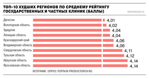 Россияне оценивают работу частных клиник выше, чем государственных, но разница в их оценках не так уж велика. Такой вывод сделал портал «ПроДокторов» на основе 1,1 млн отзывов пациентов, оставленных на страницах медучреждений. Изучение этих данных позволило составить рейтинг регионов. Лидером по количеству позитивных отзывов стал Севастополь, а в конце списка — Дагестан, Ярославская область и Удмуртия. Всероссийский союз пациентов считает, что различия в оценках связаны с уровнем финансирования, кадровым обеспечением и управленческими решениями.