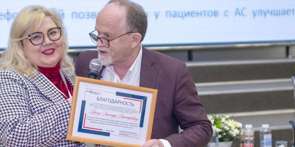 Сильный эмоциональный отклик вызвало выступление Виктора Викторовича Рериха, д.м.н., заслуженного врача РФ, врача-травматолога-ортопеда высшей категории, начальника научно-исследовательского отделения патологии позвоночника ФГБУ «ННИИТО им. Я.Л. Цивьяна» Минздрава России, который рассказал о современных возможностях вертебрологии для пациентов с анкилозирующим спондилитом. Особым моментом стали истории приглашенных пациентов, которым Виктор Викторович провёл корректирующие операции на позвоночнике. Один из выступающих пациентов поделился: